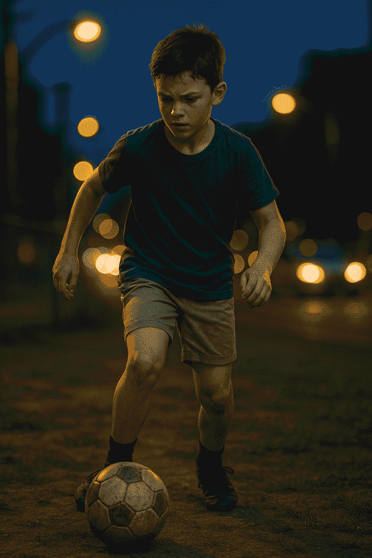 A hyperrealistic, cinematic portrait of a determined 10-year-old boy passionately playing football (soccer) on a scuffed patch of grass in an urban park. The boy is captured in dynamic motion, intensely focused on dribbling the worn leather ball. The scene is set during the ‘blue hour’ just after sunset. The immediate background features a low chain-link fence separating the park from a perpetually chaotic, busy city street. Illuminated, vintage sodium vapor streetlights cast intensely warm, orange pools of light onto the asphalt, contrasting sharply with the deep blue sky. Streaking car headlights suggest movement and the pervasive rhythm of city life. Extreme shallow depth of field (f/1.4) isolates the boy, rendering the urban background in dramatic, high-contrast bokeh. Shot on an 85mm prime lens, ultra-detailed, volumetric lighting, slight photo grain, photorealistic rendering, vertical orientation.