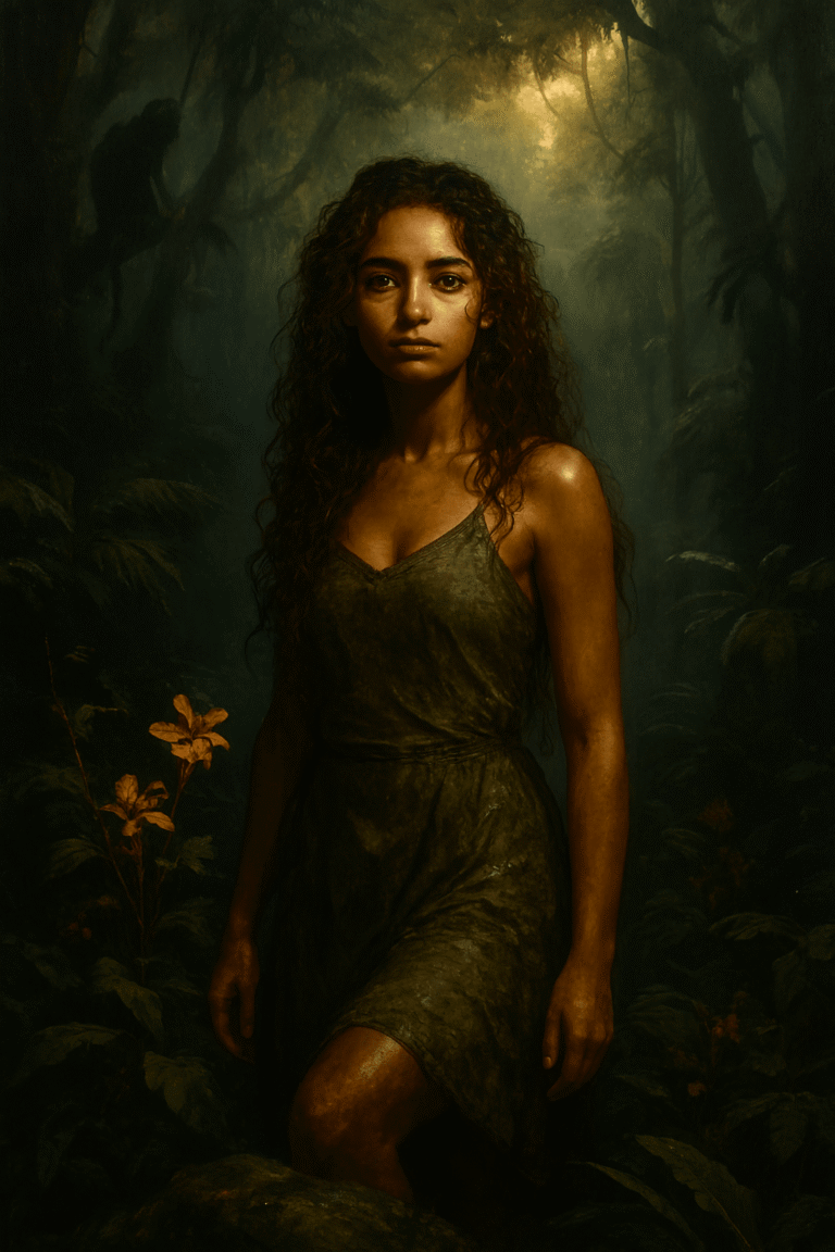 In a dense, mist-shrouded jungle, an 18-year-old girl with a radiant, sun-kissed complexion and long, curly brown hair stands atop a moss-covered boulder, surrounded by the vibrant foliage of the rainforest. The air is heavy with the scent of exotic flowers and the distant call of a howler monkey echoes through the darkness, as if the jungle itself is whispering secrets to the girl. The atmosphere is shrouded in a deep, foreboding gloom, with towering trees looming above like sentinels, their branches tangled in a canopy of emerald green. The girl’s eyes, a deep, piercing brown, seem to hold a world of wonder and mystery, as if she is on the cusp of discovering some ancient, hidden truth. The lighting is cinematic, with shafts of golden light piercing through the canopy above, casting dappled shadows on the girl’s skin and illuminating the intricate patterns of the jungle floor. Every detail, from the delicate petals of the flowers to the intricate textures of the tree bark, is rendered in exquisite, high-fidelity detail, as if the viewer can reach out and touch the very fabric of the jungle. The image is rendered in stunning 8K resolution, with a level of sharpness and clarity that is almost unsettling, drawing the viewer into the heart of the jungle. The color palette is rich and nuanced, with a deep, muted color grading that evokes the sense of a world both ancient and timeless. Every brushstroke, every nuance of light and shadow, is infused with a sense of drama and tension, as if the very fate of the jungle hangs in the balance.
